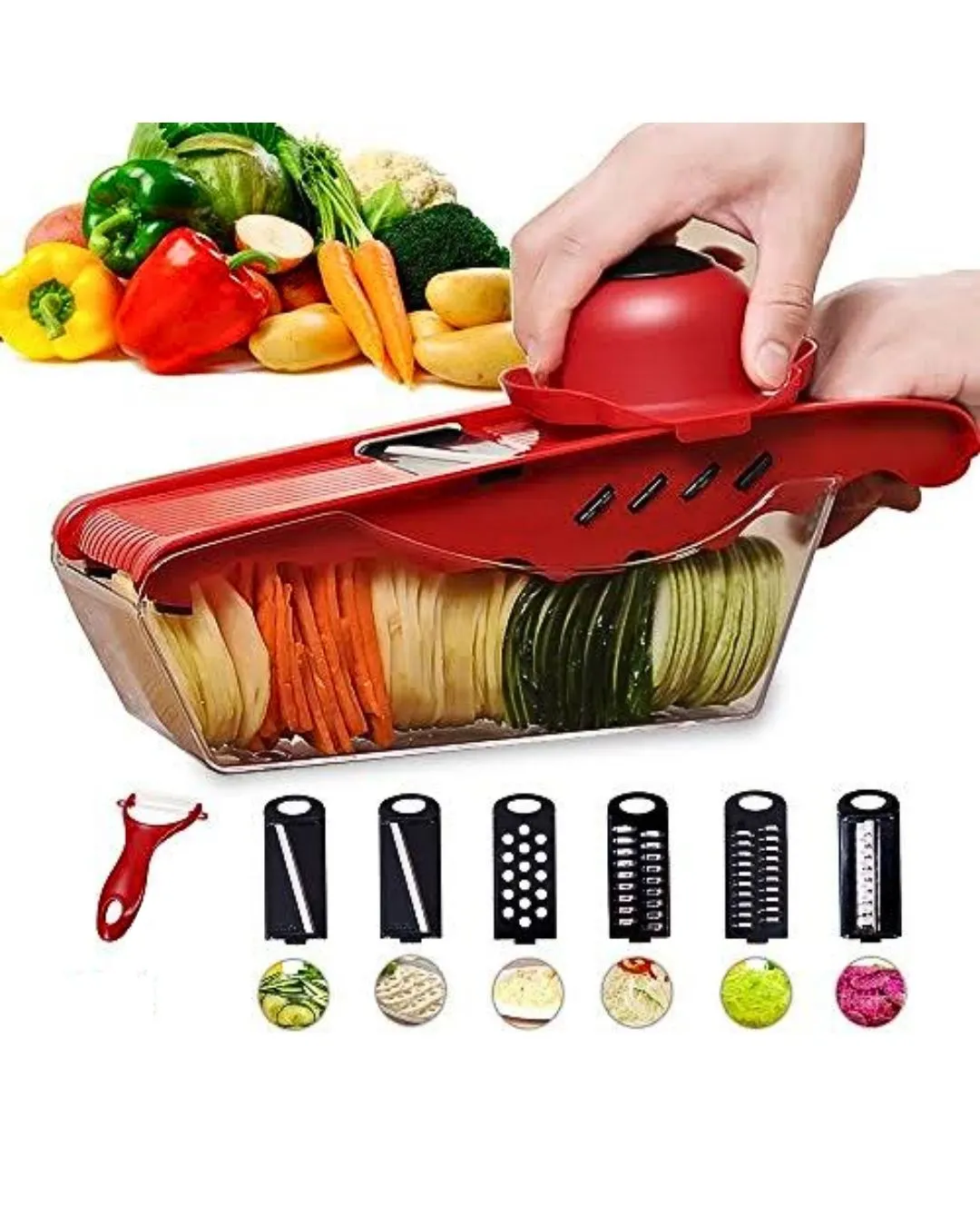 10-in-1 Mandolin Vegetable Cutter with 6 stainless steel blades, finger guard, and built-in container. Slice, julienne, or grate veggies, cheese, fruits, and more—quickly and safely. Red color. Includes bonus peeler.