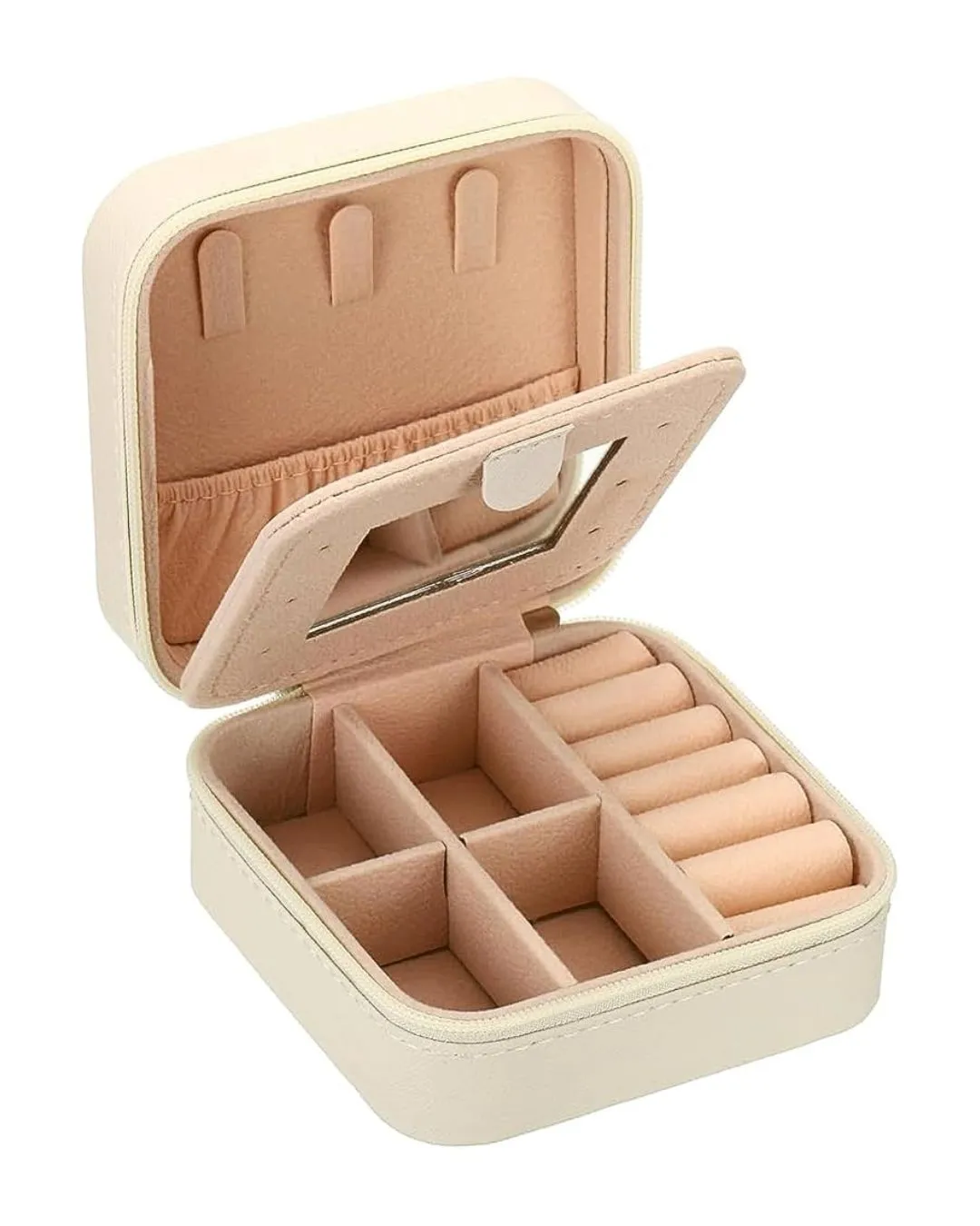 - Multi-Compartment Storage – holds rings, earrings, necklaces, bracelets, and a watch in one compact box.